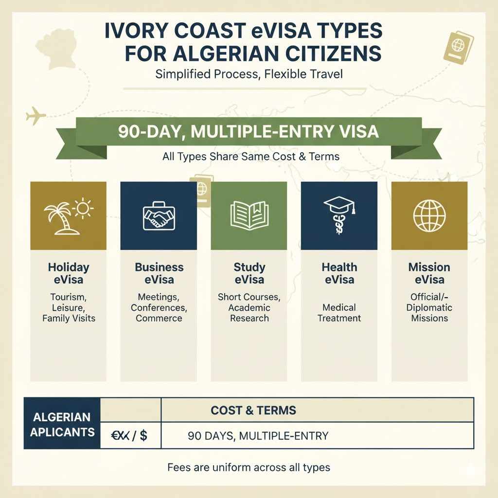 The Ivorian eVisa system is refreshingly straightforward. While it offers different "purposes" for travel, the core visa issued is a 90-Day, Multiple-Entry visa. This provides fantastic flexibility for Algerian travelers.