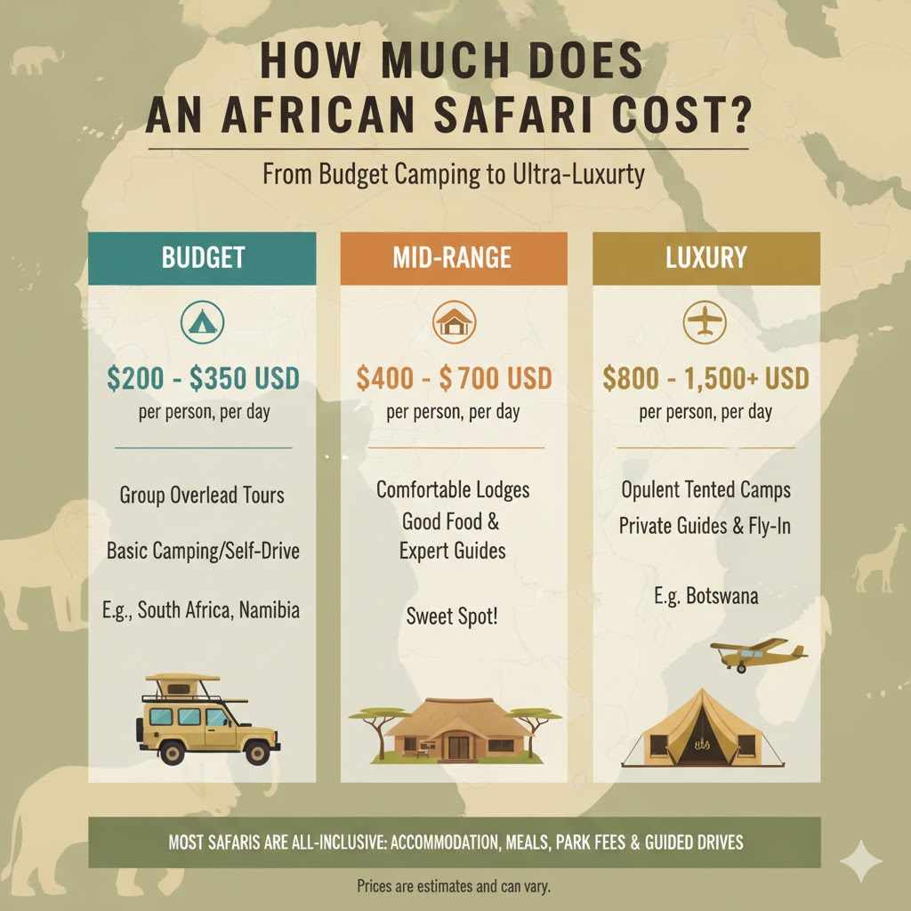 This is the "how long is a piece of string" question. A safari can range from a budget-friendly camping trip to an ultra-luxury fly-in experience.